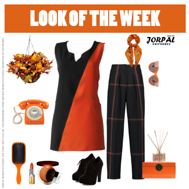 Escolhemos a nossa túnica Verse, em tons laranja, com umas calças em tom preto & laranja.