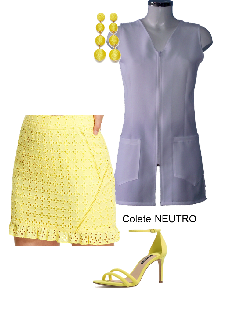 Conjugue o seu colete Neutro - num tom base - com uns sapatos e uma saia em tom de amarelo baunilha. Pode juntar ainda uma bijuteria dentro do mesmo tom ou, se preferir, com diferentes tons pastel.